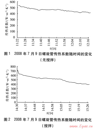 螺旋管傳熱系數(shù)隨時(shí)間的變化見圖1~2。