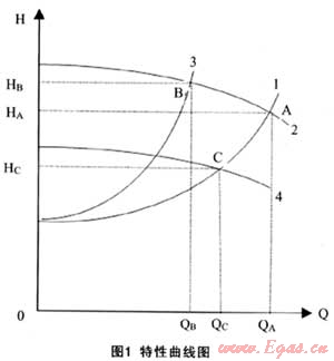見圖1,當(dāng)閥門全部打開時(shí),供水系統(tǒng)的阻力特性是曲線1;額定轉(zhuǎn)速時(shí),泵的揚(yáng)程特性是曲線2。這時(shí),供水系統(tǒng)的工作點(diǎn)為A點(diǎn);流量為QA;揚(yáng)程為HA;電動(dòng)機(jī)的軸功率與面積0QAAHA成正比。