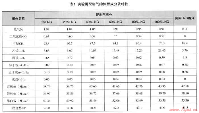 按照上述方案配制的LNG以不同比例(0、20%、40%、60%、80%、100%)與實驗室管輸氣摻混即可模擬真實情況下用戶處的氣源組分。配氣裝置見圖1,配氣時采取西氣-乙烷-氮氣多次交替進(jìn)入的方式,盡可能保證均勻。監(jiān)測膜式燃?xì)獗硖幍娜細(xì)鉁囟?,以便于進(jìn)氣量的修正。配氣的目標(biāo)原則是華白數(shù)與目標(biāo)氣一致,燃燒勢盡可能接近。表1給出了實驗室配制的測試用氣組分及特性,以LNG比例作為標(biāo)識。作為對比,同時給出了LNG的實際組分。
