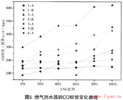 7臺燃?xì)鉄崴髟诓煌壤齃NG下基本上沒有出現(xiàn)C0排放超標(biāo)問題,均在國標(biāo)允許的范圍之內(nèi),僅品牌2-A在80%LNG和100%LNG時出現(xiàn)了較為顯著的C0超標(biāo)現(xiàn)象。