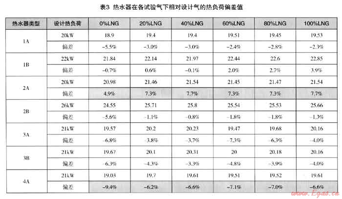 比較各型號熱水器在設(shè)計氣下的熱負(fù)荷,得出在氣源從100%管輸氣變化到100%LNG時每種熱水器的熱負(fù)荷偏差值。表巾熱負(fù)荷偏差較大者用棕色底紋標(biāo)識出??芍獰崴?-A與4-A在氣源變化時會發(fā)生比較明顯的響應(yīng),可能導(dǎo)致用戶處的不滿。