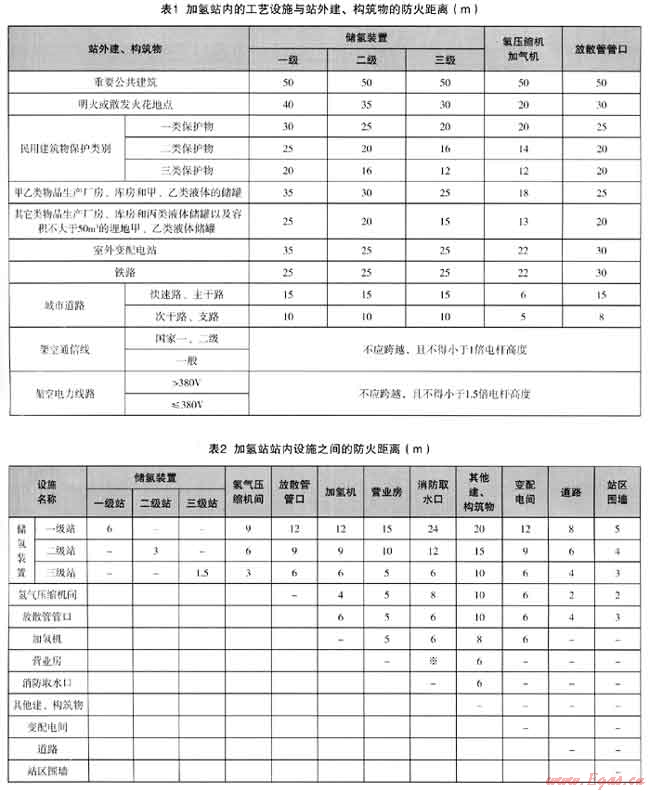 加氫站是甲類(lèi)火災(zāi)危險(xiǎn)眭設(shè)施,必須在設(shè)計(jì)上保證其安全可靠。在加氫站進(jìn)行站址選擇和站內(nèi)建、構(gòu)筑物及設(shè)備平面布局設(shè)計(jì)時(shí),必須符合上海市城市規(guī)劃和站區(qū)防火安全的要求,參照上海市地方規(guī)范《燃料電池汽車(chē)加氫站技術(shù)規(guī)程》,確保加氫站與站外重要公共建筑物、明火或散發(fā)火花地點(diǎn)、民用建筑和廠(chǎng)房、庫(kù)房、儲(chǔ)罐、鐵道、鐵路、架空通信線(xiàn)、架空電力線(xiàn)路等保持足夠的防火距離滿(mǎn)足表1的要求。