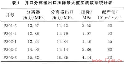 普光氣田開發(fā)井生產(chǎn)后,8臺(tái)井口分離器都頻繁出現(xiàn)過出口壓差過大的現(xiàn)象,其中5臺(tái)最嚴(yán)重,壓降最高時(shí)達(dá)4.44MPa,井口分離器出口壓降最大值實(shí)測(cè)數(shù)據(jù)統(tǒng)計(jì)表見表1。