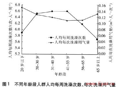 不同年齡段人群人均每周洗澡次數(shù)、人均每次洗澡用氣量見圖1。由圖1可知,對于不同年齡段人群,人均每周洗澡次數(shù)曲線呈兩邊低中間高的形態(tài),20~55歲年齡段的人群洗澡比較頻繁,65歲以上年齡段人群人均每周洗澡次數(shù)最低,這也與該年齡段的生理狀況有關(guān)。人均每次洗澡用氣量曲線呈中間低兩邊高相態(tài),由此可知,洗澡次數(shù)越頻繁,每次洗澡用氣量越小。