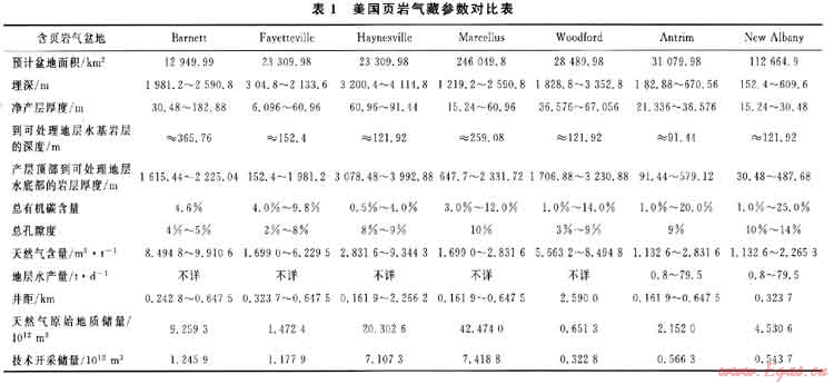目前發(fā)現(xiàn)的頁(yè)巖氣藏主要穿過了南部的48個(gè)州(除阿拉斯加和夏威夷外),最活躍的頁(yè)巖氣藏是Barnett、Haynesville、Marcellus、Antrim、Eagle Ford和New Albany等氣藏。表1總結(jié)了美國(guó)優(yōu)選頁(yè)巖氣藏的地質(zhì)參數(shù)。表2不僅提供了頁(yè)巖氣儲(chǔ)層的地質(zhì)參數(shù),而且給出了通過對(duì)比某些關(guān)鍵參數(shù)評(píng)估頁(yè)巖氣盆地的方法。這些參數(shù)也應(yīng)用在頁(yè)巖氣井的完井設(shè)計(jì)中。