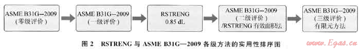 1) 新版ASME B31G—2009采用的分級評價方法便于評價人員根據(jù)現(xiàn)場操作難易程度、資料詳細(xì)程度以及評價精度等要求選擇不同的評價等級進(jìn)行操作。大大提高了工作效率和評價結(jié)果的精確度,具有很強的實用價值。