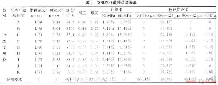 依據(jù)行業(yè)標(biāo)準(zhǔn)SY/T 5108—2006《壓裂支撐劑性能指標(biāo)及測試推薦方法》相關(guān)規(guī)定,對現(xiàn)場抽取的9家(種)支撐劑樣品進(jìn)行了分類性能評價(jià),結(jié)果見表1。