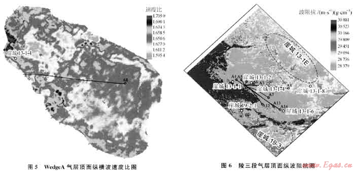 理論計算、正演模擬和實際道集分析均表明崖城13-1氣田陵三段氣層具有Ⅳ類AV0特征,那么三亞組和陵三段氣層周邊的勘探目標(biāo)是否也屬Ⅳ類AVO特征呢?三亞組的WedgeA砂體在2000年之前只有崖城13-1-4井鉆遇,鉆遇的地層厚度為111.3m,但氣層厚度只有6m,且物性較差,滲透率只有14mD,之前的地質(zhì)研究成果認(rèn)為該砂體的開發(fā)潛力不大。但是該砂體在地震資料上反射特征清楚,通過對比追蹤、AV0分析和疊前AV0反演認(rèn)為該砂體具有與陵三段氣層相同的Ⅳ類AVO特征(圖4),從反演得到的WedgeA頂面縱橫波速度比分布圖(圖5)可以看出崖城13-1-4井鉆遇了WedgeA砂體的邊部,相對整個砂體來說崖城13-1-4井位置物性較差,而該砂體東部物性變好、含氣性特征更明顯、厚度也變大,通過崖城13-1-4井層速度預(yù)測砂體A8井處氣層厚度在50m以上,基于上述的地震預(yù)測結(jié)果決定鉆探A8井。于2000年在崖城13-1-4井東邊鉆探了A8井,在該砂體鉆遇氣層厚度達(dá)65.2m,滲透率高達(dá)1600mD、日產(chǎn)氣150×104m3,是目前該氣田產(chǎn)量最高的井之一,從而證實了鉆前的地震預(yù)測結(jié)果。