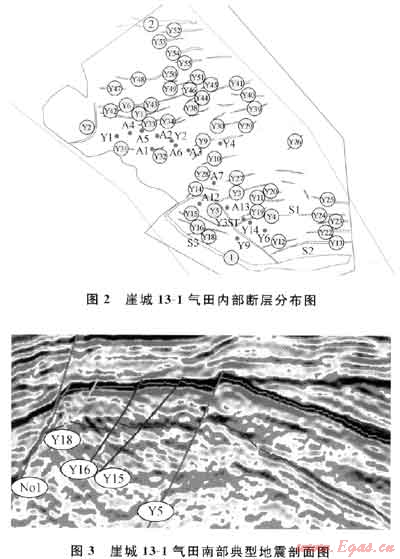 氣田內部發(fā)育著兩組斷裂(圖2):一組為北西向和近南北向的斷裂,另一組NEE向的斷裂將崖城13-1氣田分成南、北兩塊,其中南塊又可分為S1、S2及S3塊;氣田內部斷層的斷距較小,一般都小于70m(圖3),未完全錯斷陵三段近200m厚的儲集層,似乎對油氣不起封堵作用。