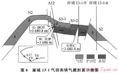 由于陵三段儲層厚,氣柱高度大,一直被認為是具統(tǒng)一氣水邊界的均一氣藏。但氣田范圍內發(fā)育許多斷層,因斷距較小,斷層的封堵性常未引起重視。隨著十幾年的持續(xù)開發(fā),氣田的動靜儲量差別較大。在構造南塊S3-1高部位的A12井,竟然在主力氣層出現水層,其氣水界面高出“統(tǒng)一”氣水界面276m,令所有研究者十分困惑。通過對該井壓力資料進行分析,A12井區(qū)北側斷層Y3隨著生產壓力下降而開啟,開井時地層壓力系數只有0.7。為進一步挖掘與S3-1相鄰的S3-2的儲量,又鉆了Y9井,結果更令人費解,只鉆遇薄氣層及厚水層,與S3-2東側低部位的Y6井矛盾,因為Y6井無水層。經小層對比,儲層橫向變化不大且斷層并不能斷開儲層段。