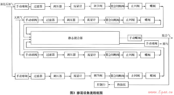 混合天然氣和LPG分別經(jīng)計量調(diào)壓后同時進入混合器,混合器中設(shè)置了折流板和旋轉(zhuǎn)板,兩種氣體在混合器中經(jīng)過多次折返、旋轉(zhuǎn)流動,最后達到95%以上的混合效率。調(diào)節(jié)系統(tǒng)主要由一臺設(shè)在LPG回路的氣動薄膜調(diào)節(jié)閥和相關(guān)控制部件組成,由控制系統(tǒng)根據(jù)天然氣的流量或混合氣的熱值自動控制調(diào)節(jié)閥的開度,從而實現(xiàn)對LPG進入混合器流量的調(diào)控,達到設(shè)定的華白指數(shù)。