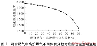 對于混合燃氣中高爐煤氣體積分數(shù)從0~90%的變化,高爐煤氣不同體積分數(shù)對應的混合燃氣理論燃燒溫度見圖1。