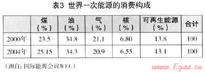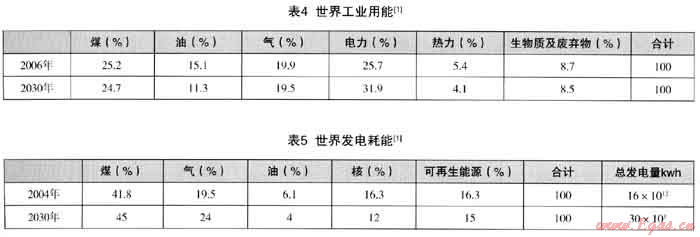 (1) 世界一次能源的消費(fèi)構(gòu)成、世界工業(yè)用能構(gòu)成和世界發(fā)電用能構(gòu)成可見表3、表4、表5