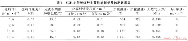 1) 焚燒爐試驗(yàn)日焚燒氣量最高達(dá)到10.5×104m3/a,超過其設(shè)計(jì)能力(10×104m3/a),并平穩(wěn)運(yùn)行30min。該焚燒爐在超負(fù)荷情況下仍能正常運(yùn)轉(zhuǎn),表明該焚燒爐性能可靠。
