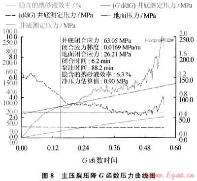 主壓裂實(shí)際入井液量385.0m3,加入粉陶4.4m3、30~50目陶粒30.4m3、20~40目陶粒9.3m3,最高砂比35%,平均砂比20.6%。主壓裂G函數(shù)分析曲線如圖8所示。
