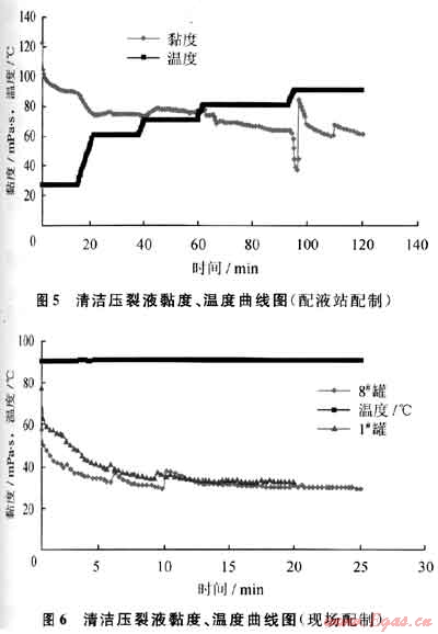 為確保壓裂液質(zhì)量,分別取配液站配制和現(xiàn)場配制壓裂液采用HAAKE-VT550流變儀進(jìn)行實(shí)驗(yàn)評價(jià)(圖5、6)。由圖可見,采用配液站罐內(nèi)水配制的清潔壓裂液黏度比配液站清水配制的清潔壓裂液黏度低50%(從60mPa·s下降至30mPa·s),說明水質(zhì)對清潔壓裂液黏度影響很大,但仍能滿足壓裂要求。