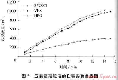 采用巖心流動實(shí)驗(yàn)裝置評價(jià)該壓裂液對巖心的傷害,其狀況如圖3所示。胍膠壓裂液破膠液在通過API導(dǎo)流槽時(shí),由于破膠液中存在殘?jiān)估塾?jì)體積隨時(shí)間的增長越來越慢,最后漸漸地趨向于零,傷害嚴(yán)重。而所研制的VES壓裂液破膠液通過API導(dǎo)流槽時(shí),表現(xiàn)出了與2%KCl溶液相似的流動特性,該壓裂液對支撐裂縫帶的傷害非常小。