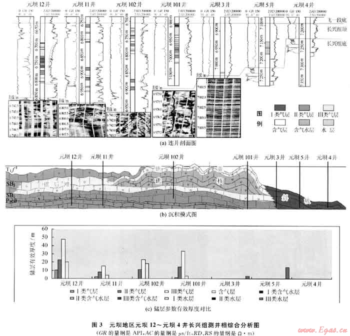 通過(guò)測(cè)井相對(duì)比分析,從元壩12~元壩102~元壩4井,長(zhǎng)興組沉積相為臺(tái)地邊緣礁灘-礁前斜坡-淺水陸棚的沉積過(guò)程。有利相帶沉積特征為臺(tái)地邊緣礁灘相沉積,亞相為生物礁和礁后淺灘,微相為礁蓋、礁核、生屑灘和砂屑灘,這類相帶的儲(chǔ)層裂縫及溶蝕孔洞發(fā)育,以Ⅱ、Ⅲ類儲(chǔ)層為主,儲(chǔ)層含氣性較好,為勘探開(kāi)發(fā)井部署的首選目標(biāo)。