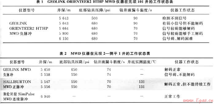 2) 川t東北工區(qū)的實(shí)踐表明:普通的HALLIBURTON MWD儀器的工作環(huán)境溫度不宜超過130℃;GEOLINK ORIENTEER2 HTHP儀器可適應(yīng)更高的溫度和壓力,但必須要求有足夠的底部鉆具壓降,當(dāng)其應(yīng)用于井深超過6000m的井時(shí),底部鉆具壓降應(yīng)在800psi以上且鉆井液漏斗黏度不宜大于70s。
