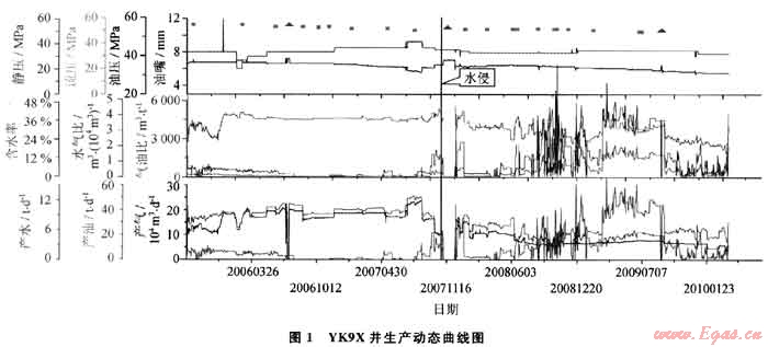 從雅克拉凝析氣藏某氣井的生產(chǎn)曲線可看出:當(dāng)氣井產(chǎn)地層水后,產(chǎn)氣量有所下降,而產(chǎn)油量不會降低甚至有所增加,這就導(dǎo)致了生產(chǎn)氣油比的降低(圖1)。