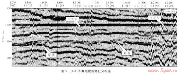 本次預(yù)測(cè)成果經(jīng)JLSL16井實(shí)鉆證實(shí),在茅口組獲氣,從平面成果圖分析,JLSL16井應(yīng)與龍4井具有相似的沉積環(huán)境。圖5為過JLSL16井下二疊統(tǒng)頂層拉平地震剖面(該測(cè)線為圖4中測(cè)線B),圖中3種不同的地震相特均表明JLSL16井在茅三時(shí)期該區(qū)域?yàn)闉┫鄡?chǔ)層發(fā)育有利區(qū),預(yù)測(cè)成果與實(shí)鉆結(jié)果吻合。
