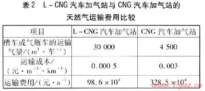 由于加氣站總運(yùn)營費(fèi)用的90%以上是用于購買和運(yùn)輸天然氣,因此從氣源點(diǎn)到加氣站的運(yùn)輸成本對加氣站的運(yùn)行費(fèi)用產(chǎn)生很大影響,進(jìn)而影響加氣價(jià)格。L-CNG汽車加氣站與CNG汽車加氣站的天然氣運(yùn)輸費(fèi)用比較見表2。