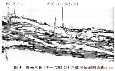 普光氣田目前已完鉆6口水平井,鉆遇氣層厚度介于398.6~623.5m之間,均達(dá)到或超過設(shè)計指標(biāo)。如P202-2H井,原為部署在P202井臺上的1口定向井,根據(jù)該井臺上P202-1井(直井)實施情況及儲層預(yù)測結(jié)果(圖4),該井區(qū)氣層厚度介于120~150m,且縱向上分布比較集中,適合打水平井,因而重新進(jìn)行了井型優(yōu)化。該井設(shè)計水平段長470m,鉆遇氣層厚度602m,比設(shè)計為斜井多鉆氣層400m。2009年5月,該井投產(chǎn)試氣,射開氣層558m,測試無阻流量686×104m3/d。