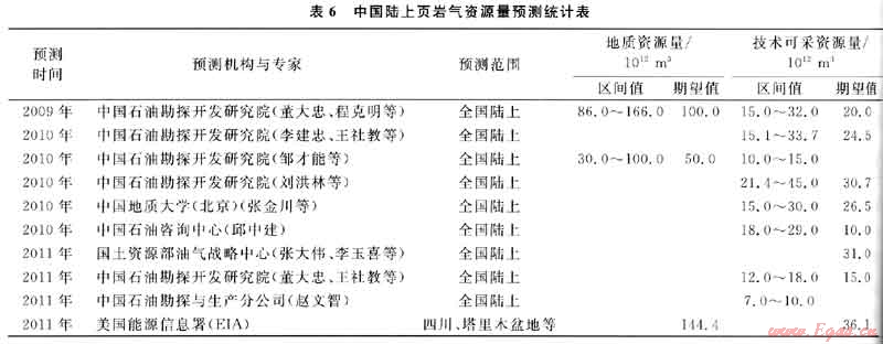 據(jù)不同學者或機構(gòu)對頁巖氣資源的預(yù)測(表6),中國頁巖氣地質(zhì)資源量介于30×1012~166×1012m3,技術(shù)可采資源量介于7×1012~45×1012m3。據(jù)此,有專家預(yù)測中國頁巖氣年產(chǎn)量近10年內(nèi)有望達到100×108m3左右,主要取決于理論突破、技術(shù)進步、成本降低和政策扶持。總的認為,中國頁巖氣具有較好的發(fā)展前景。