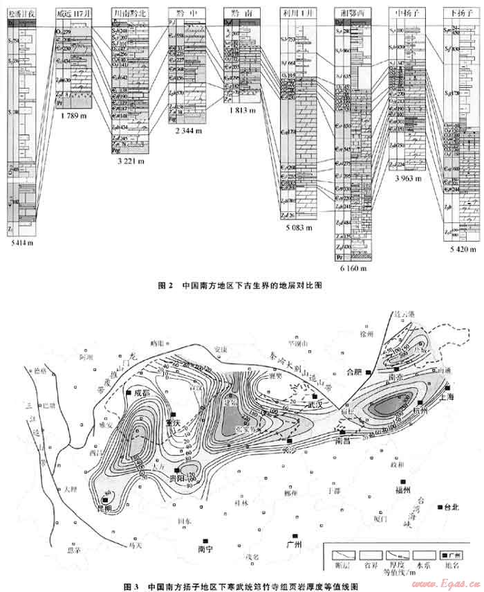 —O1s)。揚子地區(qū)的寒武系頁巖形成于早寒武世,厚度大,分布范圍遍及整個揚子地臺區(qū)(圖3),是麻江、凱里等古油藏及威遠氣田的主要烴源巖。塔里木盆地寒武紀在早期和晚期各發(fā)育一套頁巖,在柯平、塔里南、塔中隆起、塔北隆起、滿加爾坳陷等區(qū)域廣泛分布,是塔里木盆地的重要烴源巖。志留紀頁巖在揚子地區(qū)發(fā)育較好,以早直留世龍馬溪組頁巖為主,分布于整個揚子地區(qū)(圖4),是四川盆地五百梯、羅家寨、建南等石灰系氣田的主力烴源巖。此外,在鄂爾多斯盆地西緣、塔里木盆地還發(fā)育有中-上奧陶統(tǒng)平?jīng)鼋M(O2p)、印干組(O3y)頁巖,在黔南-桂中地區(qū)發(fā)育有泥盆系印堂-羅富組(D2-3y-l)頁巖,在滇東北發(fā)育了石灰系舊司組(C1j)頁巖。