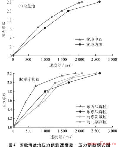 從鶯歌海盆地構造格局的角度考慮(圖4-a),可以看到對于同樣的壓力系數(shù)而言,盆地中心的速度差要低于盆地邊緣。究其原因,主要是由于盆地中心處于沉積物快速沉積區(qū),泥巖處于一種欠壓實的狀態(tài),而盆地邊緣處于沉積物路過區(qū),而且同樣深度位置盆地邊緣地層的年代要比盆地中心的地層年代老,地層速度較高。