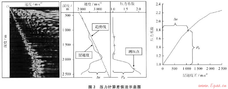 目前地層壓力預測的方法較多,但大多數(shù)都屬于經驗公式的方法,受到一定的適用條件的限制。地層速度是用于地層壓力鉆前預測和鉆后壓力計算的主要參數(shù),層速度特點是在正常壓實的地層中其值隨深度的增大而增大,而在異常超壓地層中其值比正常值小,因此可憑借層速度的異常變化來判斷和檢測異常高壓地層[7~1O]。經過多年對鶯歌海盆地壓力預測及計算方法研究,發(fā)現(xiàn)“差值法”(圖2)可以應用于鶯歌海盆地壓力計算,其基本原理是用速度異常量來確定異常壓力。其標準為:△v=0為正常壓實地層;△v<0為異常高壓力地層。該方法需要在地區(qū)性的壓力預測數(shù)學模型的基礎上定量地計算出孔隙壓力,其優(yōu)點是不需要先計算上覆壓力,減少誤差和一些不可控因素。對于這一方法而言,速度差與壓力系數(shù)對應的壓力預測模型的確定是其中的難點和重點。