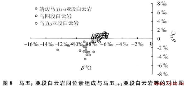 5) 大氣淡水與“富鎂鹵水”混合的白云巖化模式:由于大氣淡水的參與,在古隆起東側地區(qū)的馬五5沉積層中形成大氣淡水與“富鎂鹵水”的混合水帶,這種成巖介質環(huán)境對馬五5的白云巖化作用也會產生顯著的影響,主要表現(xiàn)在2個方面:①稀釋了“富鎂鹵水”,使成巖流體濃度降低,進而減少白云石結晶時的結晶中心形成總數(shù)(晶核形成數(shù)),這會使白云石生長更趨緩慢,結晶更趨自形、粗大;②使先成白云石重結晶。據(jù)Clyde Moore的研究認為[13],大氣淡水的參與會使先成白云石重結晶,并使其地球化學特征發(fā)生重組,這也會導致其晶體結構變粗和白云石自形程度的提高。對盆地古隆起東側馬五5白云巖的地球化學分析結果表明:馬五5白云巖有序度一般為0.85~0.95,尤其是其C—0同位素特征(δ13C:-0.79‰~0.07‰;δ18O:-7.1‰~-6.9‰),的確與馬五1+2蒸發(fā)潮坪形成的泥粉晶白云巖存在較大的差異(圖8)。