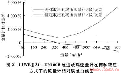 由表1、2得到LUYBⅡ31—DN1008旋進(jìn)旋渦流量計(jì)在兩種取壓方式下的流量計(jì)相對(duì)誤差曲線(xiàn)如圖2所示。