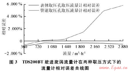 以某公司生產(chǎn)的TDS200BT旋進(jìn)旋渦流量計(jì)為例,系統(tǒng)運(yùn)行時(shí)間為60s,標(biāo)準(zhǔn)裝置的滯止平均溫度為29.7℃,空間平均濕度為42%,流量計(jì)的平均溫度為29.3℃,在表體取壓孔取壓和管道取壓孔取壓的流量計(jì)檢定試驗(yàn)數(shù)據(jù)分別如表3、4所示。兩種取壓方式下的流量計(jì)相對(duì)誤差曲線(xiàn)如圖3所示。