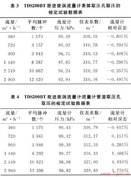 以使用廣泛的LUYBⅡ31—DN1008旋進(jìn)旋渦流量計(jì)為例,系統(tǒng)運(yùn)行時(shí)間為60s,標(biāo)準(zhǔn)裝置的滯止平均溫度為28.9℃,空間平均濕度為30%,流量計(jì)的平均溫度為28.3℃,在表體取壓孔取壓和管道取壓孔取壓的流量計(jì)檢定試驗(yàn)數(shù)據(jù)分別如表1、2所示。