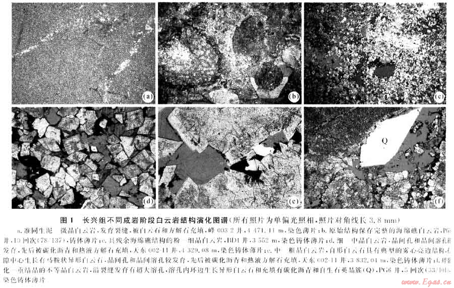 長興組成巖期埋藏交代成因的礁、灘相白云巖類型豐富,按原始結(jié)構(gòu)保存狀況、晶粒大小和結(jié)晶程度,可細(xì)分為如下4種與各成巖階段相對應(yīng)的、連續(xù)演化的結(jié)構(gòu)-成因類型:①早成巖階段,原始結(jié)構(gòu)保存基本完好的顆?;蚪赴自茙r(圖1-b),保存有少量原生粒間孔和生物體腔孔;②中成巖階段,原始結(jié)構(gòu)被不同程度破壞的殘余顆?;蚪赴自茙r(圖1-c)及細(xì)-中晶白云巖(圖1-d),白云石具半自形-自形晶和霧心亮邊結(jié)構(gòu),以發(fā)育晶間孔和晶間溶孔為主;③晚成巖階段,原始結(jié)構(gòu)幾近消失的中-粗晶白云巖(圖1-e),較粗粒的白云石自形晶具霧心亮邊結(jié)構(gòu)和強(qiáng)烈重結(jié)晶,發(fā)育較多晶間孔、晶間溶孔和超大溶孔,孔內(nèi)往往充填有碳化瀝青、馬鞍狀異形白云石和高富鍶的熱液方解石;④構(gòu)造隆升階段,原始結(jié)構(gòu)完全被破壞的碎裂化白云巖(圖1-f),溶蝕作用強(qiáng)烈,以廣泛發(fā)育溶裂縫和超大溶孔為顯著特征,溶孔中充填有碳化瀝青、異形白云石和熱液方解石,局部充填有更晚期的自生石英。