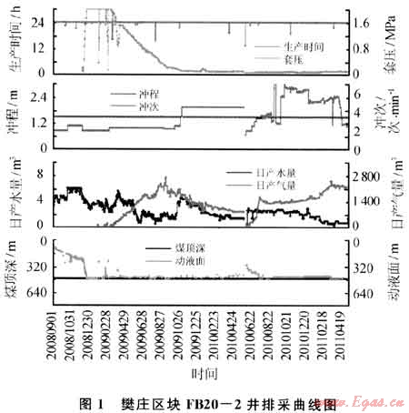 煤層氣井通過(guò)下套管固井、射孔壓裂完井后投入生產(chǎn),流體入井直接通道為射孔孔眼、井筒附近煤層壓裂破碎帶,由于煤層氣生產(chǎn)為低壓生產(chǎn),與常規(guī)油氣相比,該區(qū)域更容易被粉煤灰、泥漿、頂?shù)装迥鄮r、作業(yè)帶來(lái)入井內(nèi)的外來(lái)物質(zhì)等填充堵塞,即近井地帶污染堵塞,堵塞后煤層氣產(chǎn)量會(huì)快速遞減。用水力壓裂的方法可以解除近井地帶堵塞,而水力壓裂具有施工規(guī)模大,成本高,實(shí)施時(shí)間長(zhǎng),見效周期較長(zhǎng)等局限性。針對(duì)該類問(wèn)題,2011年以來(lái)在樊莊區(qū)塊開展了運(yùn)用高能電脈沖技術(shù)解除近井地帶污染增產(chǎn)試驗(yàn)。其基本原理是運(yùn)用高壓放電技術(shù)作用煤層氣井內(nèi)液體,使其產(chǎn)生強(qiáng)大的沖擊波,在近井地帶產(chǎn)生的壓力脈沖將井筒附近的地層污染解開[6]。該措施具有作業(yè)周期短、成本相對(duì)低等優(yōu)勢(shì),但也具有脈沖壓力波及范圍小、對(duì)選井條件判別要求高等局限性。