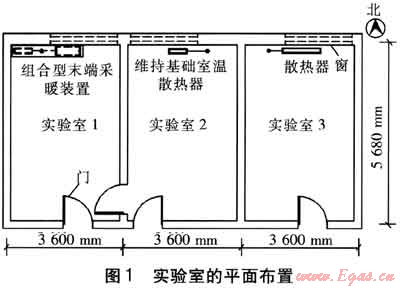 在天津市某高校3間尺寸均為3600mm×5680mm×3600mm(寬×進深×高)的實驗室中進行了實驗研究,3間實驗室的采暖裝置分別是組合型末端采暖裝置、維持基礎(chǔ)室溫的散熱器及滿足熱負荷要求的散熱器。實驗室的平面布置見圖1,圍護結(jié)構(gòu)特性參數(shù)見表1。對散熱器、供暖型風(fēng)機盤管、組合型末端采暖裝置3種采暖方式進行實驗研究。