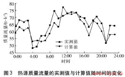 熱源質(zhì)量流量的實(shí)測值與計(jì)算值隨時(shí)間的變化見圖3。由圖3可知,除9:00和17:00偏差較大外,其余時(shí)刻相對誤差均在±10%以內(nèi),全天質(zhì)量流量的計(jì)算值與實(shí)測值的平均相對誤差為-4.1%。由于9:00與17:00為上、下班時(shí)間,管網(wǎng)流量波動(dòng)較大,系統(tǒng)處于非穩(wěn)態(tài),因此計(jì)算值與實(shí)測值偏差較大。