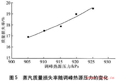 由圖5可知,較低的調(diào)峰熱源出口壓力可以降低蒸汽質(zhì)量損失率。原因在于:當(dāng)調(diào)峰熱源壓力過高時(shí),部分管段兩端壓差低,導(dǎo)致管內(nèi)蒸汽流動(dòng)過緩,甚至停滯,大部分蒸汽凝結(jié)成水排出管道。調(diào)峰熱源壓力降低后,存在流動(dòng)過緩現(xiàn)象的管道數(shù)量減少,蒸汽質(zhì)量損失率減小。因此,在投入調(diào)峰熱源時(shí),壓力若能夠保證用戶需求,不應(yīng)再提高??稍谡{(diào)峰熱源出口加裝壓力表和壓力傳感器,實(shí)現(xiàn)實(shí)時(shí)監(jiān)測、調(diào)整。