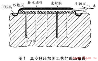 在采用真空預(yù)壓加固軟土地基時,在密封膜上不施加重物,而把大氣作為荷載。在抽氣時,土體孔隙中的氣體首先被抽出,使密封膜緊貼于砂墊層上。砂墊層中形成的負(fù)壓,通過排水板逐漸向下延伸,并由排水板向其周圍土體傳遞,引起土體中孔隙水壓力降低,從而使土體孔隙中的水由土體向排水板滲流,最后匯至砂墊層中被射流泵排出。淺層真空預(yù)壓加固與深層真空預(yù)壓加固工藝的主要區(qū)別在于,前者采用編織布、無紡?fù)凉げ嫉忍娲皦|層,以及排水濾管的布置方式不同。真空預(yù)壓加固工藝的現(xiàn)場布置見圖1。