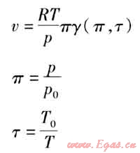 在區(qū)域2中,γ(π,τ)由理想氣體部分和剩余部分的無(wú)量綱Gibbs比自由能組成,以折算壓力π和折算溫度τ為獨(dú)立變量。比體積與基本方程的關(guān)系表達(dá)式如下: