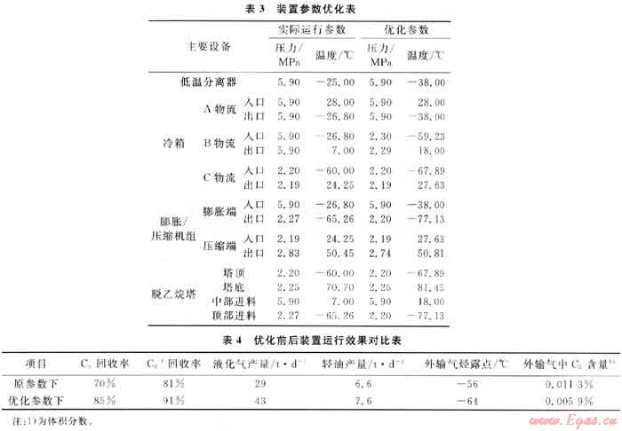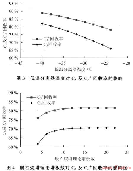 2) 在優(yōu)化條件下C3及C3+回收率分別得到大幅提高,C3回收率由原來的70%提高到現(xiàn)在的85%;C3+回收率也由原來的81%提高到現(xiàn)在的91%。