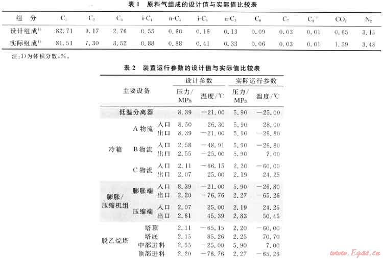 而實(shí)際生產(chǎn)中原料天然氣氣量增加為40×104m3/d,天然氣進(jìn)裝置的壓力約為6.00MPa,溫度約為25.O0℃,外輸干氣壓力約為2.80MPa,液化氣產(chǎn)量為29.0t/d,輕油產(chǎn)量為6.6t/d,外輸氣烴露點(diǎn)為-56.O0℃,外輸氣中C3組成為0.0113%(體積分?jǐn)?shù))。進(jìn)裝置的天然氣的組成及裝置運(yùn)行參數(shù)的設(shè)計(jì)值與實(shí)際值比較表分別見表1、2。