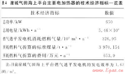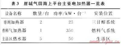 在崖城氣田海上平臺上,除了三甘醇再沸騰器以外,還有一些生產(chǎn)設備和生活設施是需要使用熱源的,其主要電加熱器一覽表見表3。