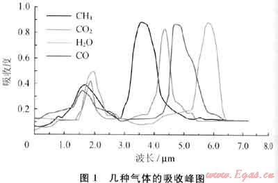 每種氣體都有自己的特征紅外吸收頻率,不受其他氣體吸收峰的干擾,吸收的能量與氣體在紅外光區(qū)內(nèi)的濃度有關(guān),大部分光學(xué)甲烷檢測儀就是據(jù)此來進行設(shè)計的[10]。甲烷(CH4)分子的光譜吸收區(qū)為3.26μm,在3.26μm附近,C0、C02和H2O分子等沒有明顯吸收,對甲烷氣體檢測的影響幾乎可以忽略。由lambert-beer定律可知,當一定頻率強度為I0的入射紅外光穿過氣體時,氣體吸收自己特征頻率紅外光的能量后,而使出射光能量減弱為I,即吸收度I=I0exp(-μCL),其中μ為氣體吸收系數(shù);C為待測氣體濃度;L為光程長度。CH4、C02、C0和H2O的吸收峰圖如圖1所示。