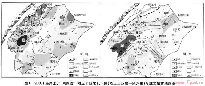 SLSC2層序基準(zhǔn)面上升導(dǎo)致的湖盆擴(kuò)張期,對(duì)應(yīng)須四-須五下亞段沉積期。基準(zhǔn)面上升早期(須四下亞段沉積期),受周緣山系隆升影響,湖盆范圍明顯小于須下盆,須四段底部在全盆地范圍內(nèi)普遍發(fā)育有礫巖沉積,尤以川西坳陷和川東北坳陷最為發(fā)育,典型如在彭州獅山剖面、大巴山前緣的萬(wàn)源石冠寺,而位于川中古隆起中段東側(cè)的合川炭壩、華鎣山溪口、磨溪和龍女寺氣田地區(qū)只發(fā)育有薄層細(xì)礫巖,說(shuō)明川中古隆起及其周邊地區(qū)受“安縣運(yùn)動(dòng)”的影響相對(duì)較小。該時(shí)期龍門(mén)山以及米倉(cāng)山-大巴山前緣以發(fā)育沖積扇沉積體系為主,在川西安縣地區(qū)向南往坳陷湖盆中心直接由沖積扇過(guò)渡為扇三角洲沉積體系,由盆地邊緣向盆地中心,沉積物由粗變細(xì),在孝泉-豐谷地區(qū)明顯可見(jiàn)北部扇三角洲平原礫巖向南相變?yōu)榍熬壣皫r、砂泥巖互層。盆內(nèi)其他地區(qū)主要以辮狀河三角洲入湖為特征,主要存在米倉(cāng)山-大巴山、川東重慶、川南宜賓-威遠(yuǎn)、川西南天全-平落壩等多個(gè)物源區(qū)。湖盆中心主要位于川西南彭山-眉山一帶,瀘州地區(qū)亦存在局部湖盆。
