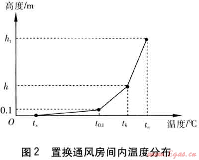 在分析置換通風房間溫度控制時,設(shè)定室內(nèi)溫度在垂直方向上具有線性變化規(guī)律。距地面0.1m處是人體腳踝的位置,腳踝是人體暴露于空氣中的敏感部位,因此該高度的空氣溫度t0.1不應引起人體的不適。從舒適度出發(fā),設(shè)計人員往往關(guān)心的是人員頭部與腳踝之間的溫差。采用置換通風時,室內(nèi)溫度變化由3部分組成: