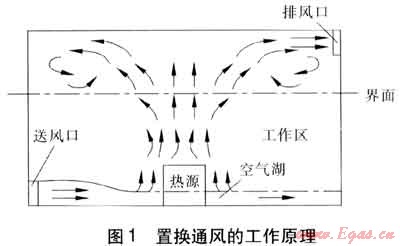 置換通風的核心技術(shù)是利用工作區(qū)的熱源加熱送風氣流,使其利用自然作用力卷吸工作區(qū)內(nèi)污染物及余熱,并從上部排出。因此,置換通風適用于高度大于3m的空間,如廠房、影院、體育館等。