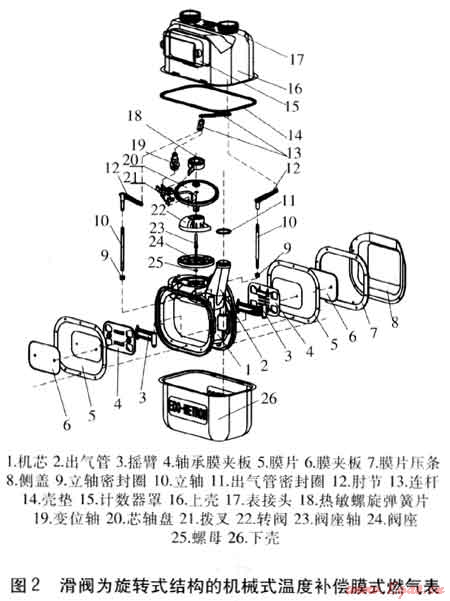 滑閥為旋轉式結構的機械式溫度補償膜式燃氣表是新型結構,體積小,結構簡單緊湊,見圖2。